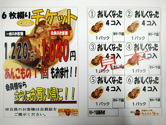 4コ入たこ焼 6枚綴りチケットを販売しています。